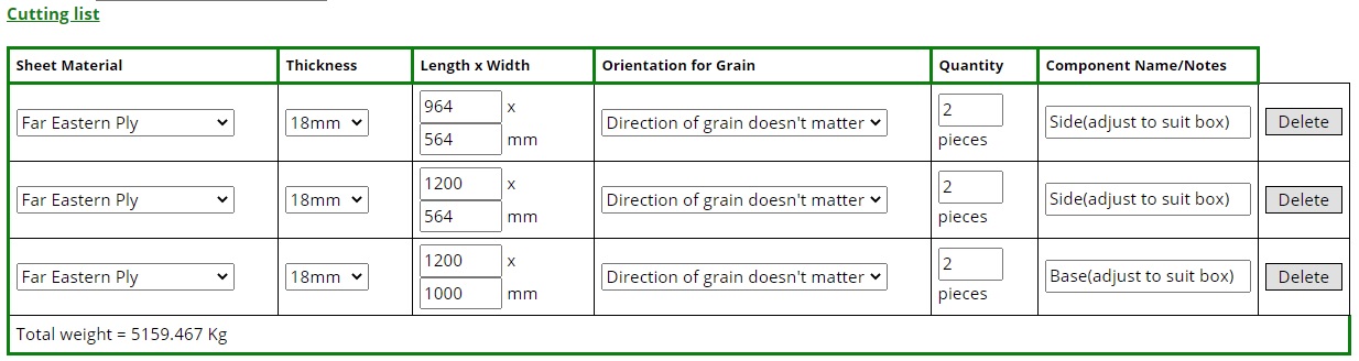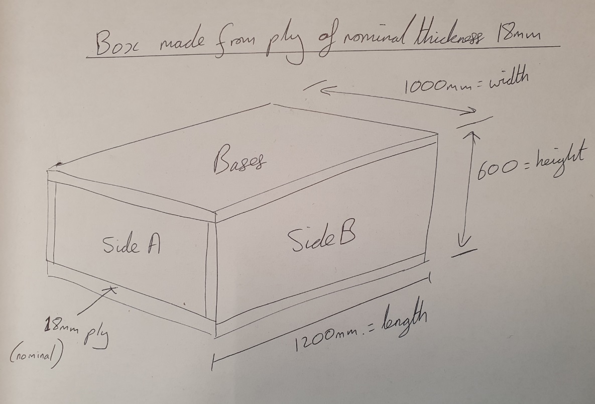 The problem with stating sizes to make a box is that the thicknesses you choose from are nominal thicknesses and often finish 0.5mm different,e.g.,the actual thickness of 18mm ply could finish at 17.5mm. This can cause the sides of a box to be not flush with each other if you are presuming the nominal thicknesses to be the exact size, e.g., if you are making the box below from 18mm(nominal) ply 'Side B' needs to be 1200mm by (600 - 2 x actual thickness)mm and not (600 - 2 x 18)= 564mm. If you state in the component name 'Side(Adjust to suit box)' we will know that 564mm is a nominal size and that we need alter this size to account for the discrepancy in thickness. The same applies to 'Side A' which you would give sizes of 564 x 964mm and a name of 'Side(Adjust to suit box)'. We would then alter the sizes to suit your box. Below is a cutting list that you would have to enter for a box of size 1000(width)x600(height)x1200(length)mm.